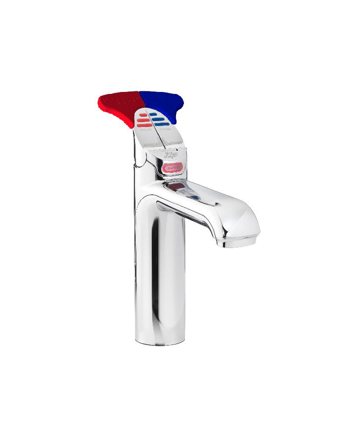 Zip HydroTap Classic Accessible Boiling, Chilled, Sparkling, Filtered water system features large brightly coloured Braille lever handles. The system features a single under bench command centre including full colour interactive touch screen display with pin code protection and customisable settings including 2 boiling water safety modes, 3 energy saving modes including ON/OFF timers and sensor activated 'sleep when it's dark', 'Quiet' mode with automated intelligent fan speed adjustment, antimicrobial protection impregnated into key water paths for enhanced hygiene, 100% water efficient air cooled technology, 0.2 micron water filtration and a refillable CO2 cylinder.