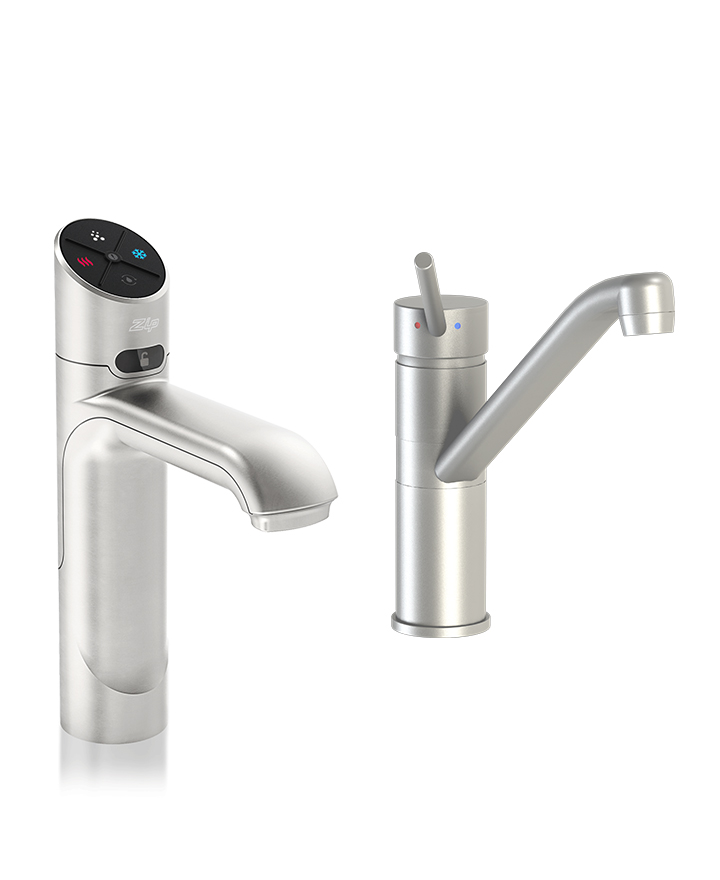 Zip HydroTap Classic Plus 5 in 1 Boiling, Chilled, Sparkling, Filtered water plus Hot and Cold washing up water from two separate taps. The system features a single under bench command centre including full colour interactive touch screen display with pin code protection and customisable settings including 2 boiling water safety modes, 3 energy saving modes including ON/OFF timers and sensor activated 'sleep when it's dark', 'Quiet' mode with automated intelligent fan speed adjustment, antimicrobial protection impregnated into key water paths for enhanced hygiene, 100% water efficient air cooled technology, and 0.2 micron water filtration. Easy to install integrated ventilation tray included.