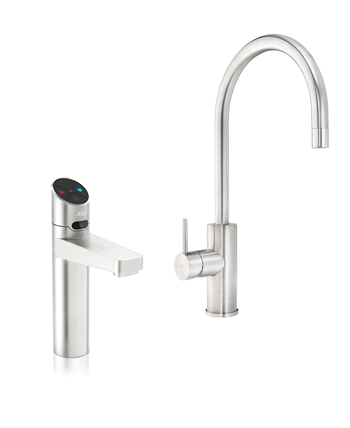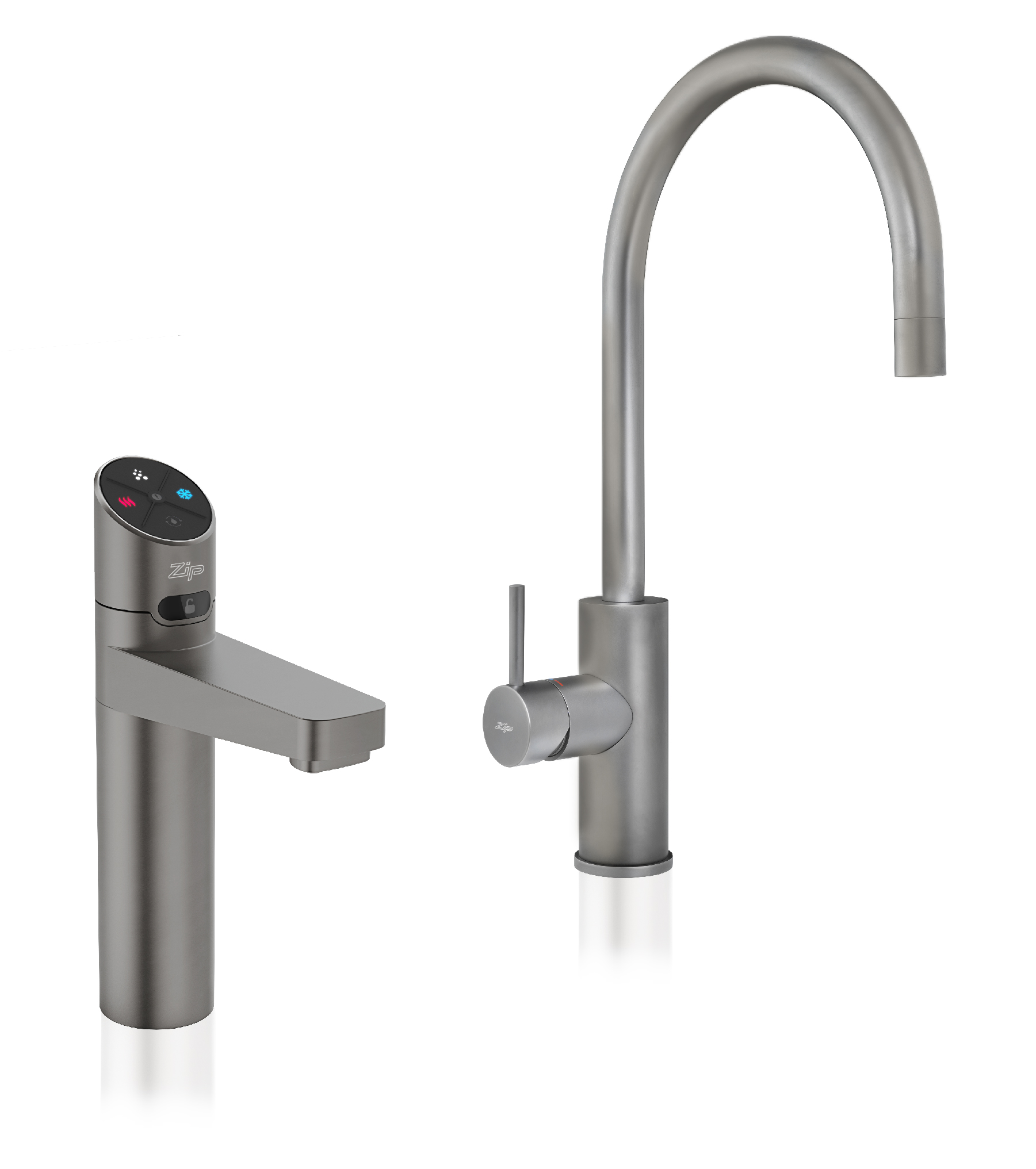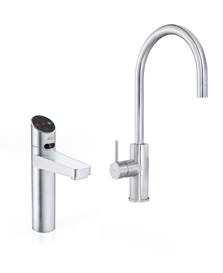 Zip HydroTap Design Range 4 in 1 Boiling, Chilled, Filtered water plus Hot and Cold washing up water from two separate taps. This water system features a single under bench command centre including full colour interactive touch screen display with pin code protection and customisable settings including boiling water safety mode, 2 energy saving modes including ON/OFF timers and 2 hour sleep mode, 'Quiet' mode with automated intelligent fan speed adjustment, antimicrobial protection impregnated into key water paths for enhanced hygiene, 100% water efficient air cooled technology, 0.2 micron water filtration, and 2 disposable CO2 cylinders. Easy to install integrated ventilation tray included.
