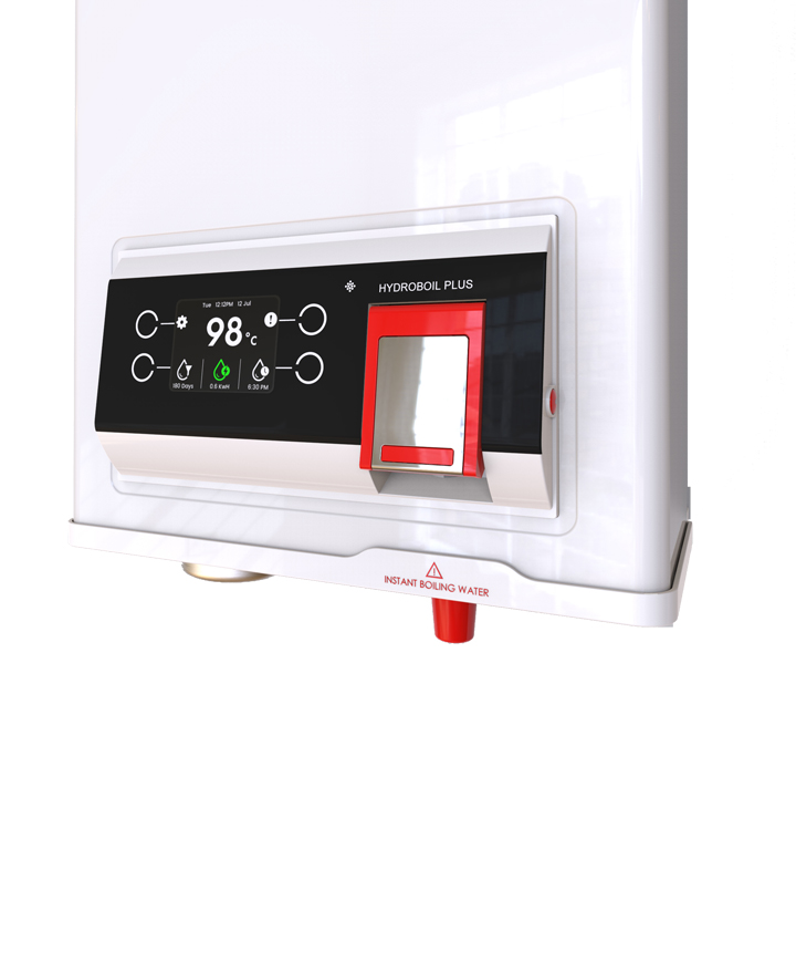 Wall mounted instant boiling water appliance with integrates 0.2 micron MicroPurity™ filtration. The Hydroboil Plus® employs twin chamber boiling water steam-heat-boost™ technology to recycle energy from steam to pre-heat the incoming cold water. The Hydroboil Plus® has inbuilt self-calibration technology, utilises highly accurate electronic temperature control and incorporates a programmable digital display with 2 energy saving modes. The main boiling water tank is wrapped with high performance insulation to ensure the healthiest water and optimum efficiency. The Hydroboil Plus® is equipped with a two-way cool-touch safety tap.