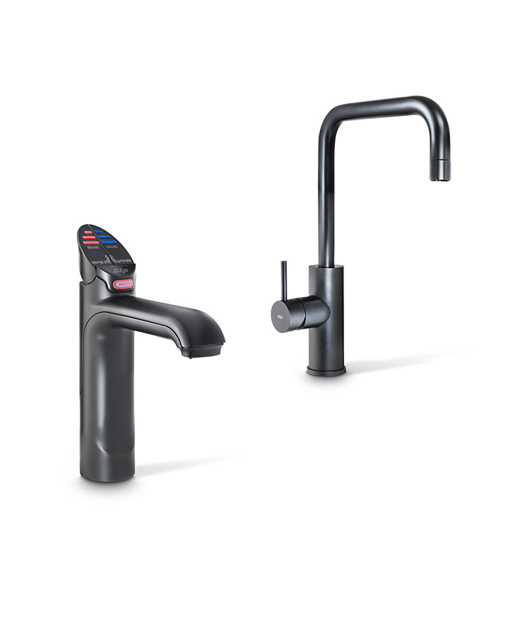 Zip HydroTap Classic 5 in 1 Boiling, Chilled, Sparkling, Filtered water plus Hot and Cold washing up water from two separate taps. The system features a single under bench command centre including full colour interactive touch screen display with pin code protection and customisable settings including 2 boiling water safety modes, 3 energy saving modes including ON/OFF timers and sensor activated 'sleep when it's dark', 'Quiet' mode with automated intelligent fan speed adjustment, antimicrobial protection impregnated into key water paths for enhanced hygiene, 100% water efficient air cooled technology, and 0.2 micron water filtration. Easy to install integrated ventilation tray included.